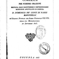"Domenico Narni Mancinelli dei Conti narnesi, Patrizio nolano, Cavaliere Gerosolimitano, Commendatore del Sovrano Ordine di Francesco I, Docente di Teologia, Consacrato Arcivescovo di Cosenza, prima, passò poi a reggere La Chiesa di Caserta, Riformatore avveduto delle Suore della SS:Concezione di Caiazzo, di Dottrina, Misericordia, Umiltà e di altre virtù pieno.